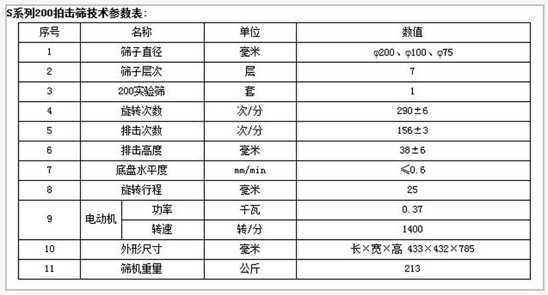 S系列200拍击筛可筛分多种特性物料的产品。适用于普通磨料粒度组成检查和超硬材料生产分级及粒度组成检查,亦广泛用于地质、冶金、粉体、化工、建工水泥、医药生产实验室,对物料进行筛分检测。该拍击筛是在原拍击式标准振筛机的基础上进行了合理的革新,改善了原机座的构造。结构更加紧凑,振动筛和振动电机机身重量减轻,产品更加耐用、轻捷、方便,维护更加简单,配件易修易购,可广泛应用于地质、粉末冶金、磨料、粉体、化工、建材、医药部门实验室筛分检测,尤其适用于金刚石微粉、超硬材料行业生产分级工序高强度、大频率地反复使用.