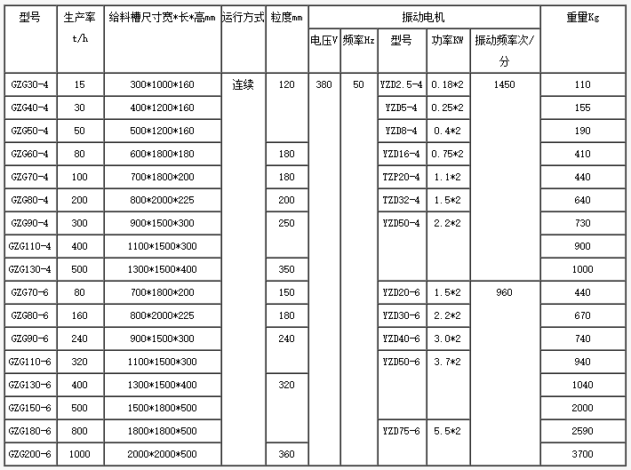 GZG系列电机振动给料机技术参数表所列给料量及振动电机选择是按给料机水平放置选定的,给料机在安装时可下倾0~15°角,其产量随下倾角度的增加而增加,或在保证产量的情况下,其电机消耗功率会随下倾角增大而减小。